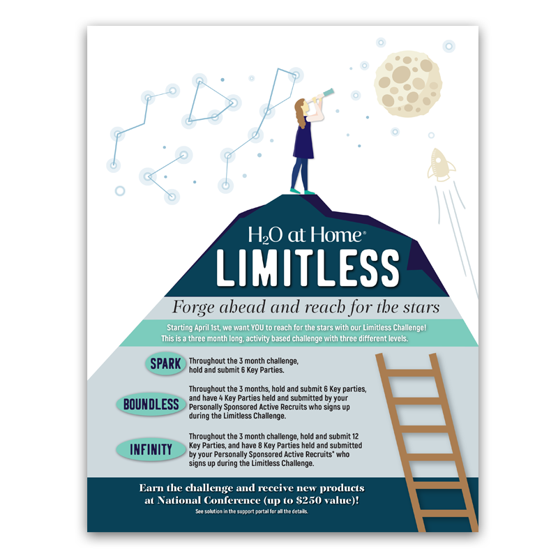 Periodically the H2O at HomeTraining team would create sales and sponsoring incentives, typically during slow months, to help the advisors build their businesses. The designer reviewed the incentive rules and illustrated each brochure to help explain the complicated rules. The main focus was to keep the incentive fun and help the advisors build their business. This piece was exclusively digital. The designer was responsible for the overall design and final production of a web and print-friendly .pdf.